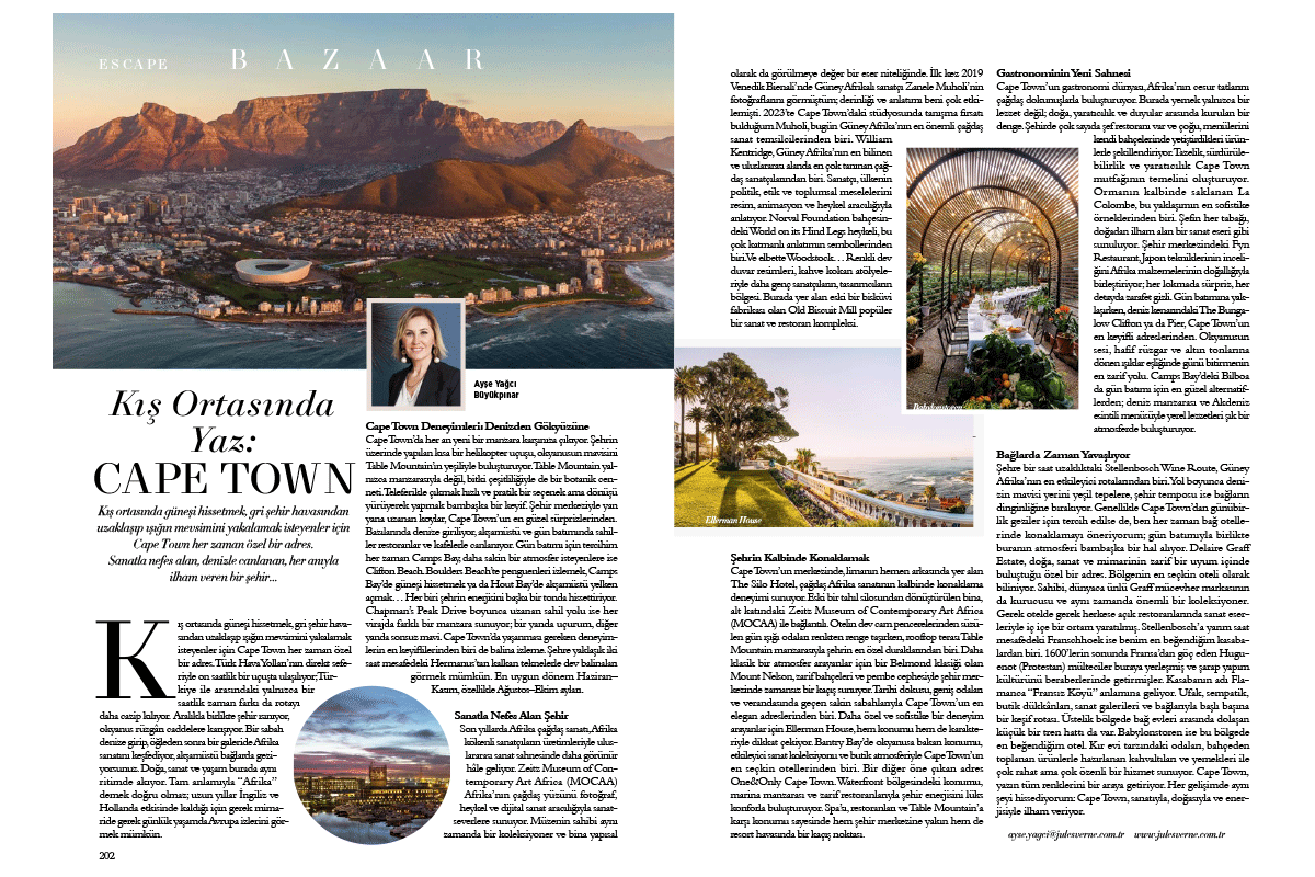 Jules Verne Business Mice Travel Kurucusu ve Genel Müdürü Ayşe Yağcı Büyükpınar, Harper’s Bazaar’ın Aralık sayısı için kaleme aldığı yazısında; Cape Town’un birbirinden farklı yüzlerini okuyucularla paylaştı. Bu özel yazıyla, doğal güzellikler eşliğinde unutulmaz deneyimler sunan Cape Town’un olmazsa olmaz duraklarına doğru ilham verici bir yolculuğa çıkmaya ne dersiniz?