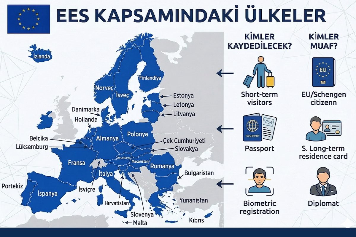 EES, kısa sürekli kalış (180 gün içinde en fazla 90 gün) amacıyla Avrupa Birliği’ne seyahat eden ve AB vatandaşı olmayan kişilerin, sisteme dahil 29 Avrupa ülkesinin dış sınırlarından her geçişlerinde kayıt altına alınmasını amaçlıyor. Sistem kapsamında yolcuların kimlik bilgileri, biyometrik verileri (parmak izi ve yüz taraması) ile giriş – çıkış tarihleri ve yerleri merkezi bir dijital veri tabanına kaydedilecek. Bu sayede sınır güvenliğinin artırılması, yasal kalış sürelerinin ihlal edilip edilmediğinin otomatik olarak tespit edilmesi ve havalimanlarında oluşan uzun kuyrukların azaltılması hedefleniyor.