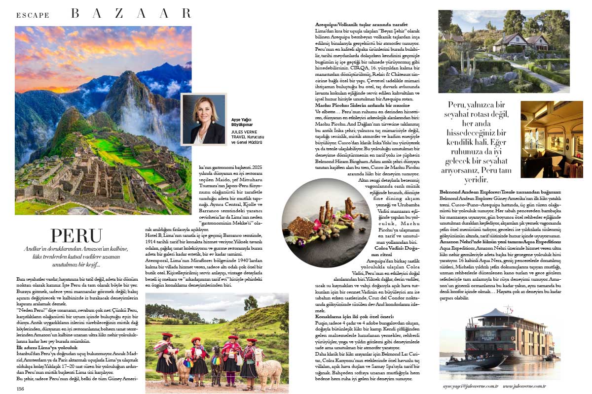 Jules Verne Business Mice Travel Kurucusu ve Genel Müdürü Ayşe Yağcı Büyükpınar, Harper’s Bazaar’ın Ağustos sayısı için kaleme aldığı yazısında, Andlar’ın doruklarından Amazon’un kalbine, lüks trenlerden kutsal vadilere uzanan unutulmaz keşif rotası Peru’nun zamansız güzelliği ve tarihi mirasını okuyucularla paylaştı. Bu özel yazıyla, doğal güzelliklerin eşliğinde unutulmaz deneyimler sunan Peru’nun olmazsa olmaz duraklarına doğru ilham verici bir yolculuğa çıkmaya ne dersiniz?