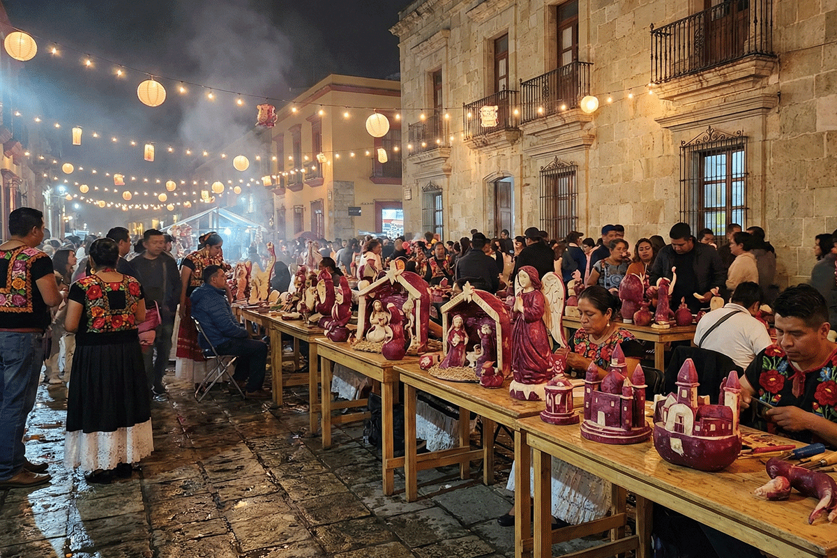 Oaxaca’da 23 Aralık gecesi turplar oyuluyor ve Noel temalı heykellere dönüşüyor. Bu etkinlik hem bir zanaat gösterisi hem de mahalle şenliği gibi yaşanıyor. Bir sebzenin böylesine görsel bir şova dönüşmesi, Noel yaratıcılığının en eğlenceli örneklerinden biri. Devasa turplar, melekler, şehir sahneleri ve Noel temaları şeklinde oyularak rengarenk bir sergiye dönüşüyor. Etkinlik o kadar popüler ki, festival için özel turplar yetiştiriliyor.