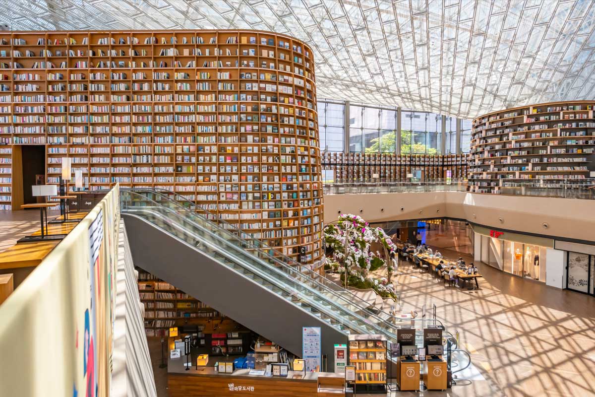 Seul’deki COEX Alışveriş Merkezi’nin B1 ile 1. Katları arasında yer alan ve toplam 2.800 metrekarelik bir alana sahip olan Starfield Kütüphanesi, Kore’de bir kütüphaneyi ticari bir kompleksle derinlemesine bütünleştiren ilk örneklerden biri. Kütüphane, 70 binden fazla kitabı barındıran 13 metre yüksekliğindeki dev raflarıyla “alışveriş+kültür” entegrasyonunun öncüsü. Açık ve davetkar tasarımıyla kütüphaneyi dinamik bir kültür merkezine dönüştüren bu ikonik mekan, Seul’ün en popüler fotoğraf noktalarından biri olarak Gangnam’ın turizm ve kültür ekonomisine güçlü bir ivme kazandırıyor.